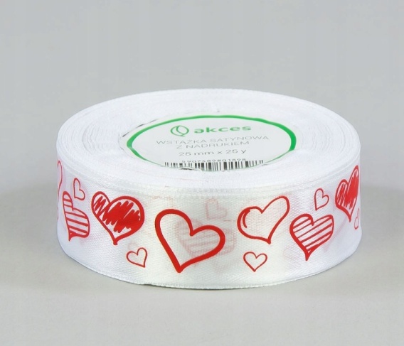 • Wstążka satynowa z nadrukiem SERCA BIAŁA 25mm x 22,75m - 1 szt