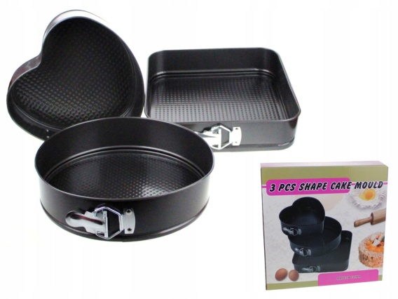 Praktyczny komplet springform składający się z trzech form o różnych kształtach: serce, okrągła, kwadratowa. Każda forma posiada wygodną klamrę, dzięki której wypiek łatwo wyjąć bez kruszenia i uszkodzeń. Idealne do: ✔ serników ✔ tortów ✔ ciast biszkoptowych ✔ wypieków na specjalne okazje (np. serduszko na walentynki!) Zalety: nieprzywierająca powłoka solidne zamknięcie łatwe mycie 3 funkcjonalne kształty w jednym zestawie